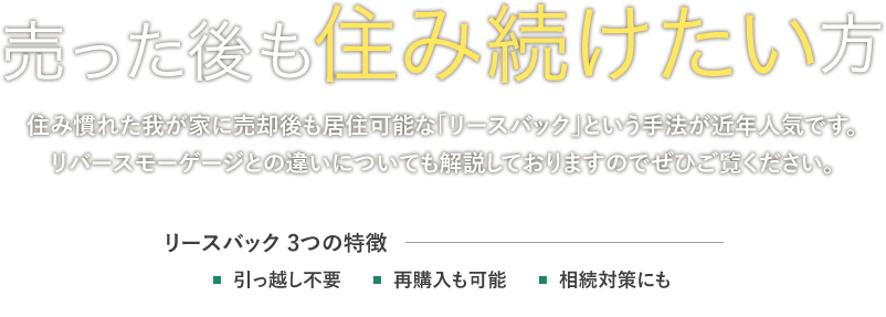 不動産の売却は、一般的な購入とは異なり、不動産業や法務、税務の膨大な知識と経験を必要とします。また、早く資金化したい場合となるべく高く売却したい場合では取るべき戦略も異なります。近年では、秘密裏に対応を進めたいケースや、売却後もしばらくは住み続けたいケース(リースバック)等、お客様の事情も複雑化しており、高度なノウハウを要するのが不動産売却の特徴です。