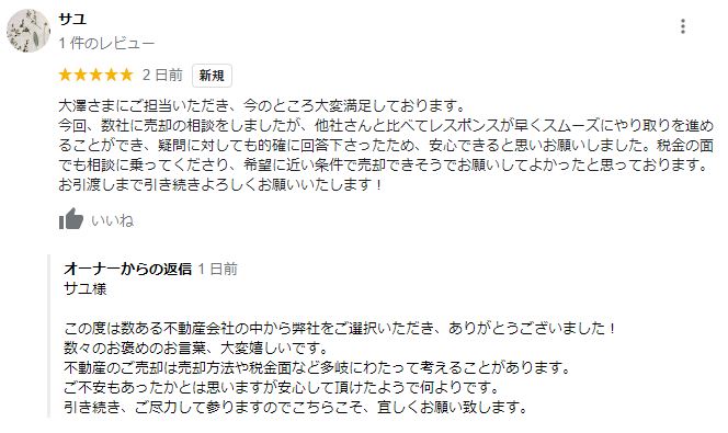 お客様よりグーグルレビューをいただきました!