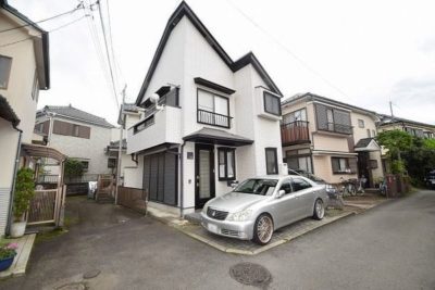 戸建ての建ち並ぶ閑静な住宅街、白いタイル貼りの外観が素敵な中古戸建です。